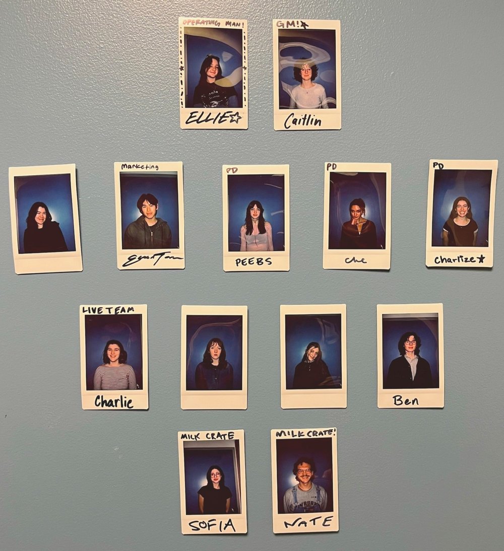 Our organization is made up of upper management, DJs, and two amazing teams. Our spring 2025 staff is pictured to the left!