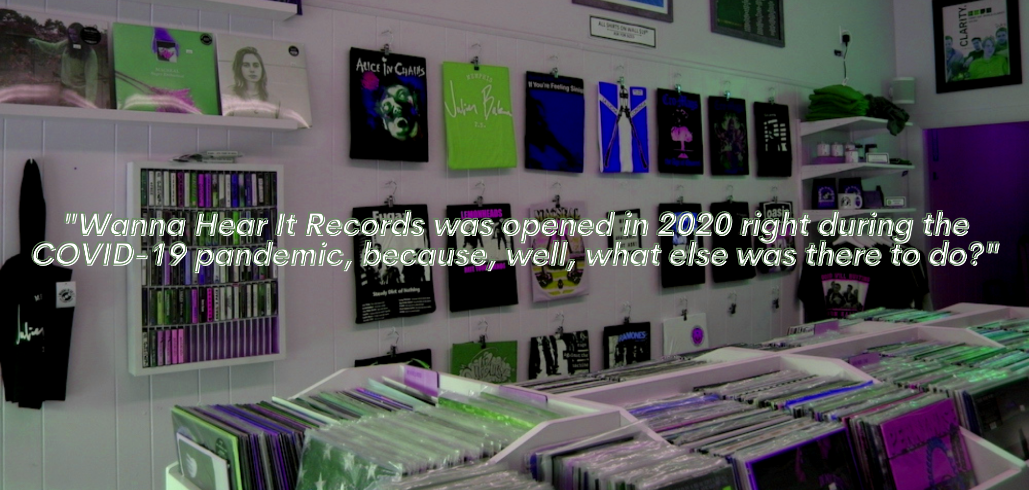 It was quiet in the store at that point, just the three of us. The sun was beaming through the small shop as I asked the first go-to question, what’s it like to start a business during COVID? “Opening during a pandemic was not something I had always envisioned,” he jokes, “but I’ve always wanted to own a record store.”  After working in a record store off and on in college and owning his own label, Joey had big dreams of opening his shop. “I’d been talking about it with my wife and we were just talking one day and I was telling her this is where I’d put this and this is how I’d do that. And she goes, ‘oh wait, you’ve actually thought about this.’” He clearly has as Wanna Hear It Records has clear niche marketing. They’ve got record store staples like cool band tees, cassettes, and posters, to official Wanna Hear It Records coffee and jewelry. After working in the music industry for 20 years, Joey knows what people want when it comes to music.