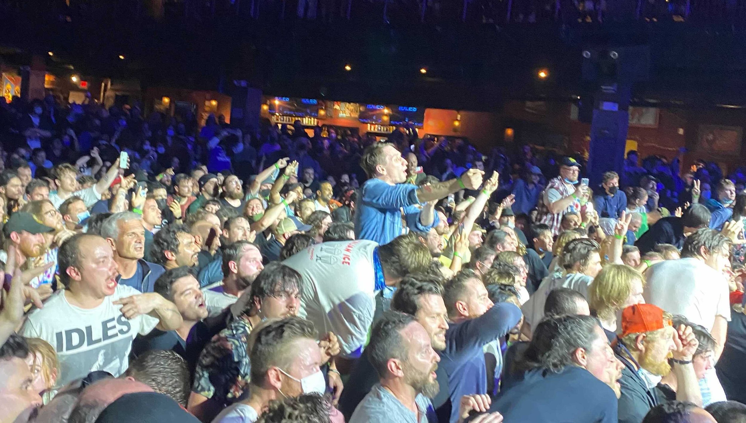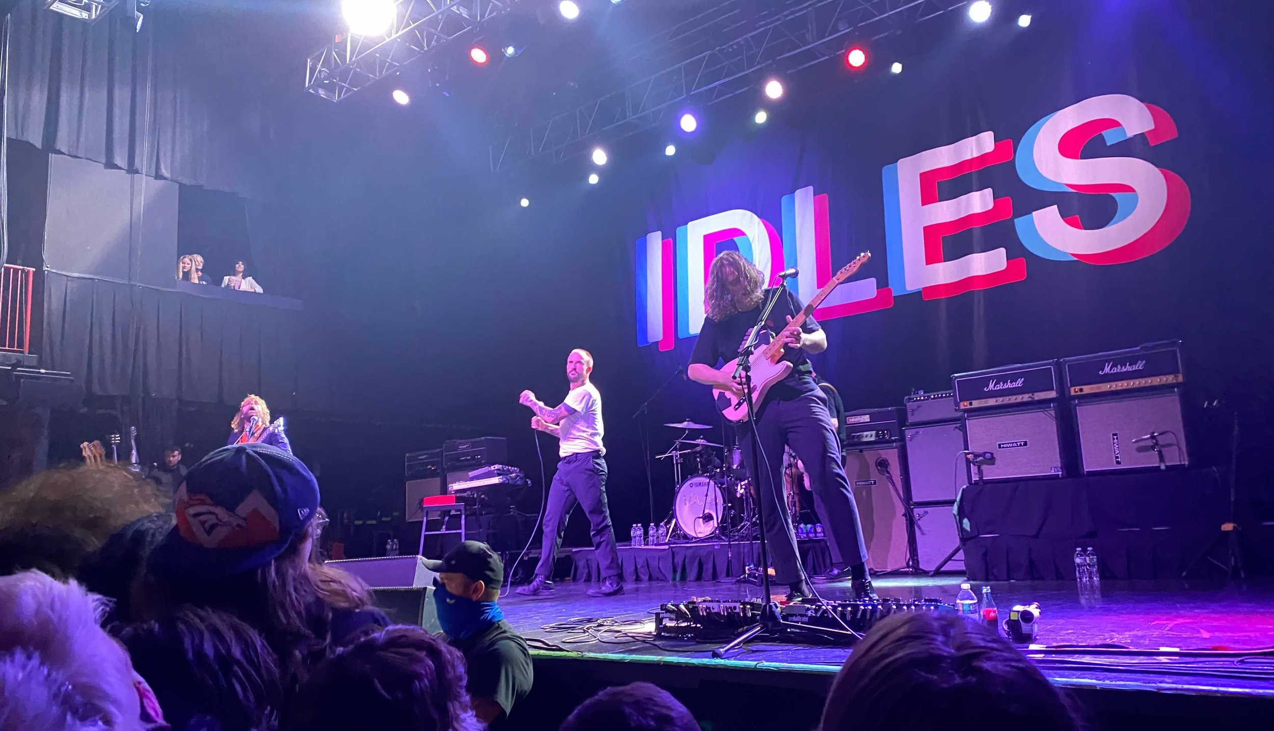 Now, there’s something important to mention before this next section. I am not a dancer. I do not mosh. I’ve never crowdsurfed, and you wouldn’t catch me dead in a circle pit. And in a crowd of decently-drunk 30-year-olds, I felt like a human pinball when people started moving. Additionally, I had pulled a muscle in my neck a handful of hours before the show, so my one reliable dance move —move your head in time with the drummer and shift from side to side— was totally off the table. It didn’t present a significant issue during Gustaf’s set, because no one was moshing to a song like “Liquid Frown”, but I knew in my heart of hearts that when IDLES got going, I was in for it. So when Gustaf left the stage, and their vice-grip on the crowd’s hearts and minds loosened, I took a moment to gauge where I stood in relation to the people around me.
