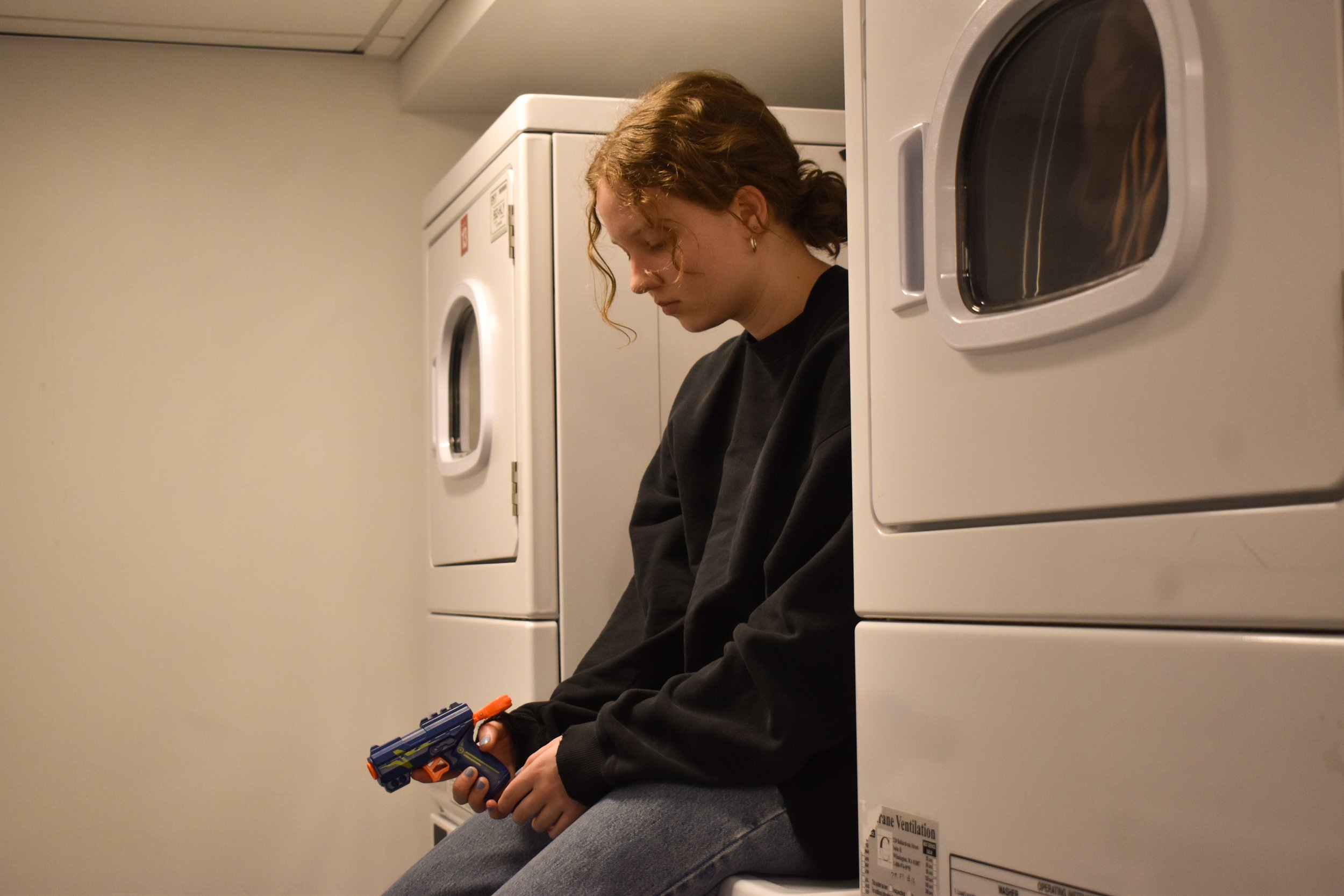 Beyond the actual prop gun, trying to capture “handgun” was really about trying to gather the essence of a sense of defeat and frustration in one image. The end of the first verse talks about being in the laundry room, and it felt like that scene captured the energy rather well. It’s something we all have to do but that can be exhausting and repetitive. Sitting on the washing machine is also to reflect that childish feeling of “the worst part of growing up is learning how young you are.”