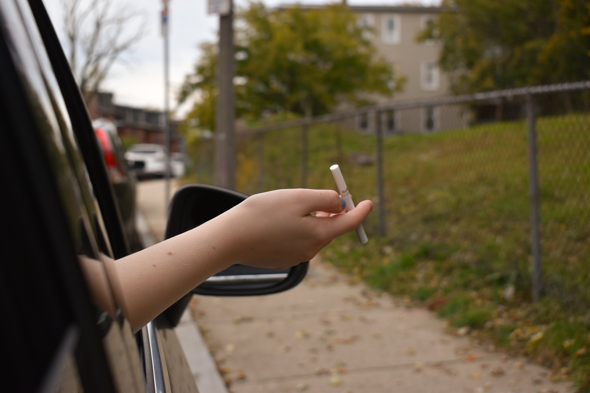 In the first song, “moms new car,” Minch tells a story about his mother and sister having an argument in the car and his mom’s relationship with smoking, and how he’s tried to get her to quit. She continues despite what he asks,“I used to fight my mom for smoking cigarettes / and in the car she killed a pack of ‘em”. The hand out the window holding the cigarette is meant to be an average sight, like something you would see at a stoplight. This song is very matter-of-fact, mostly stating things that have happened, which is displayed even in the opening line and title of the song, “I’m sittin’ in the back of my mom’s new car / while she’s fightin’ with my sister ‘bout a school she wants,” but it’s really captured in the hook’s line “This is how it is, I’m sorry.” It’s something unfortunate, but seemingly unavoidable, like, for example, a nicotine addiction.