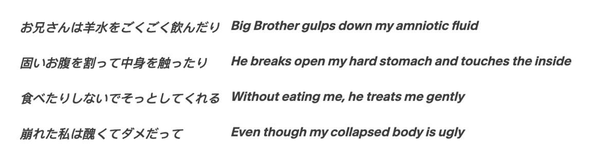 The official Hatsune Miku spotify page perpetuates the mainstream image of Miku. Bubbly, cheerful music, heavily inspired by the Hatsune Miku video game, Hatsune Miku: Project DIVA. Her top song, “Miku” is exclusively in English, produced by Anamanguchi. Here, Miku thanks her fans for her success, saying, “I’m on top of the world because of you / All I wanted to do is follow you / I’ll keep singing along to all of you”. Hatsune Miku, synonymous with Japan, a pop star from the future who represents its fast growing technology, is best known by larger audiences for a song in English. Japanese producers who stick to their native language use Miku’s “cutesy” persona to juxtapose their morbid lyrics and themes. Enter Kikuo, a producer using Hatsune Miku’s voice to create music that fans call a meeting of chaos and harmony. Kikuo has been producing VOCALOIDs since 2010, and in 2022 his song “愛して愛して愛して (Love me, Love me, Love me) was the top streamed VOCALOID song on Spotify. In an interview with NHK (public broadcaster in Japan), Kikuo states, “With Hatsune Miku, you can make a song without singing it yourself.” A great deal of production goes into VOCALOID. The sounds are layered and with a singing voice software, the singer in Kikuo’s projects can reach inhuman notes. VOCALOID is a genre intended for the computer, but the music is still created by hand. Kikuo’s lyrics feature explicitly gruesome themes, such as rape, incest, and murder. His most iconic song, “ごめんね ごめんね (Gomenne, Gomenne)” tells the story of a young girl who is desperate to be saved from her sexually abusive father.